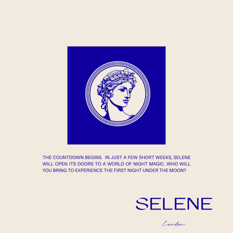 A series of images showcasing elegant branding, classical profiles, celestial themes, and promotional materials for Selene London